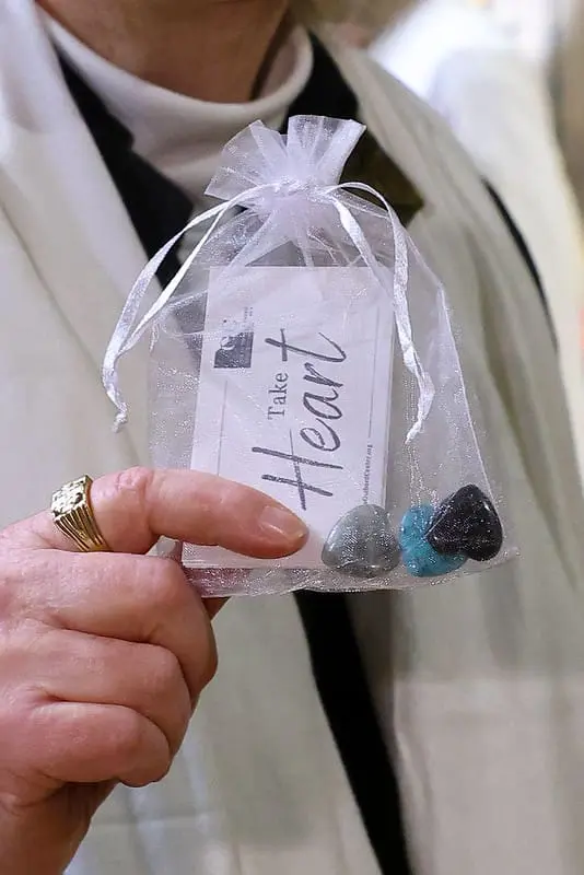 Dr. Lo wasn’t done. The Guibord Center also had a parting gift for everyone: A small bag of carved hearts with cards included that said: “Take Heart” and on the back explained that each heart was an acknowledgement of the good heart they have. The receiver was instructed to keep one heart and share the others with the statement that “You have a good heart” or “We’re all in this together.”